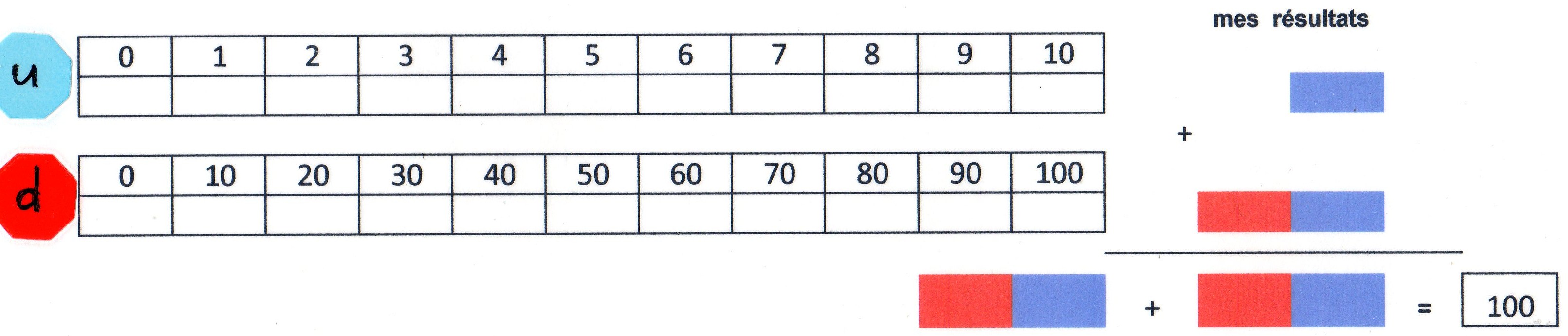 MAIS , lorsqu’il y avait des unités, par exemple 26 + ? = 100, Léo n’y arrivait pas. C’est là que l’ergo a proposé un outil qui a immédiatement fonctionné avec Léo et l’a rendu performant et surtout heureux d’y arriver très facilement.On a utilisé la fiche méthode uniquement pour la mise en place , la 1ère fois. Voilà l’outil, plastifié