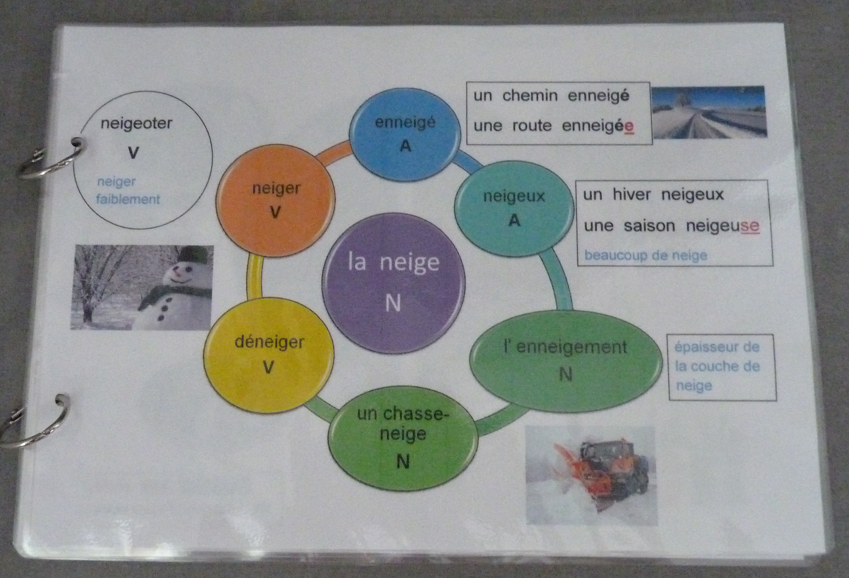 - A partir de ce mot choisi (ici neige) on a créé une carte mentale. Parfois, on a ajouté la définition, un exemple (adjectif au masculin et au féminin), une expression ….. On s’est arrêté à la nature de chacun des mots , on a recherché des mots aussi d’après leur nature : verbe neiger, d’autres verbes ? quand on enlève la neige …. et par association d’autres mots arrivent …