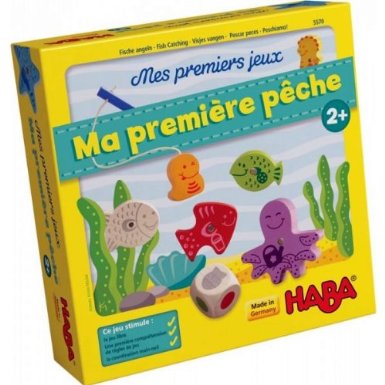 Un premier jeu de pêche qui se joue directement dans la boîte de jeu décorée. Après avoir lancé le dé, les enfants doivent pêcher un poisson de la couleur correspondant à celle du dé. Si l’enfant réussit, il prend un jouet en récompense et le pose dans la découpe correspondante de sa planchette. Dans le jeu libre, les enfants jouent librement avec la canne à pêche et les animaux de différentes couleurs. Ce jeu favorise la coordination main-oeil et la compréhension de premières règles de jeu et permet de renforcer la capacité de concentration.