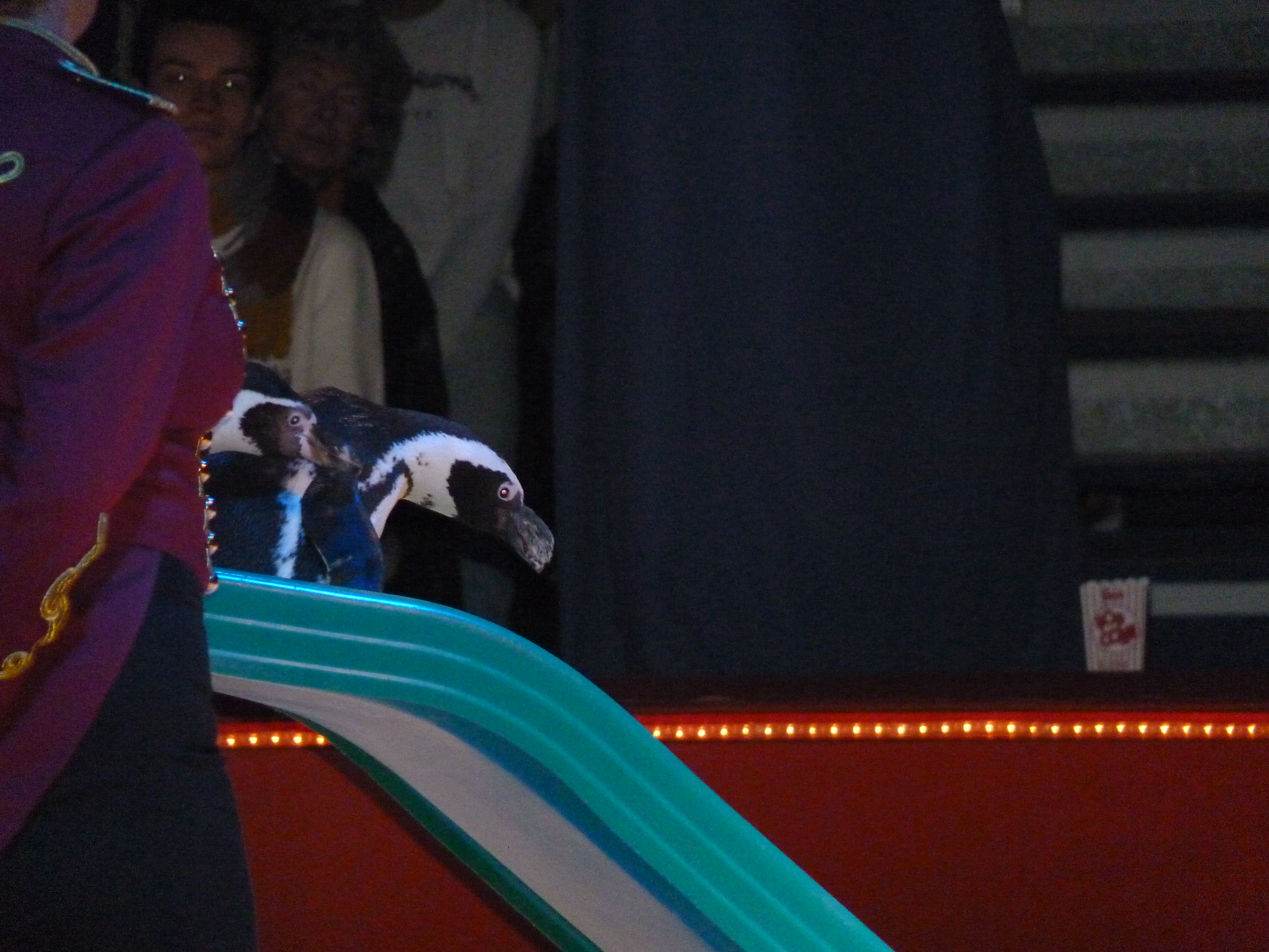 - des numéros avec des animaux mais très peu (ce qui est appréciable), alors vous ne verrez pas des éléphants ou des tigres mais plutôt des sympathiques otaries qui jouent au ballon et même des drôles de pingouins qui font du toboggan !