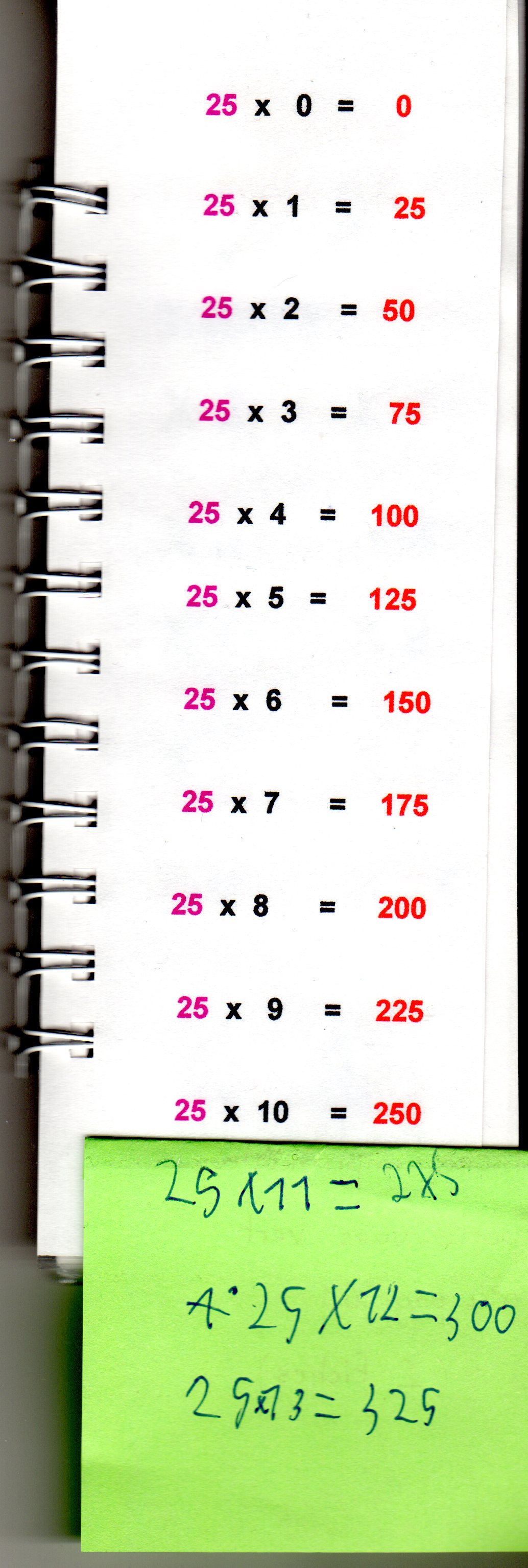 - 2ème cas : le nombre n’est pas dans la table : soit il est compris entre 2 nombres et là il ne sera pas multiple . Soit , je continue la table ….X11, … X 12 …. et je vois Léo a écrit la suite des opérations sur un « post-it » qu’il a placé provisoirement à la suite de la table ( ici X 25 )
