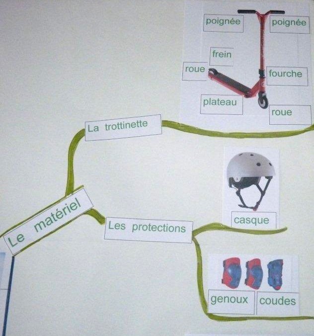 - préparation de la carte mentale à la main qui va être « le plan » de l’exposé : Léo trace une première branche (verte car c’est la couleur utilisée pour le départ dans d’autres disciplines) et écrit le mot « matériel » . C’est une grosse branche de laquelle 2 sous-branches vont partir ( trottinette et protections) .