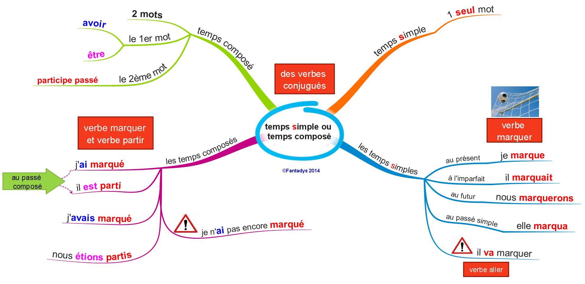 Bonjour. J’attire votre attention sur la nécessité d’être parfaitement clair et concis dans votre carte pour que Léo « ait moins besoin d’effectuer de gymnastique dans sa tête ». Le premier bénéfice d’une Mind Map est d’apporter de la structure pour naviguer de manière unique le long des différentes branches. Or, vous répétez le mot « temps » sur toutes les branches principales et vous répétez deux fois « simple » et deux fois « composé ». Ici, ce n’est pas possible pour Léo de se faire une représentation mentale du concept ni de mémoriser en faisant des liens cohérents. La Mind Map aura peu d’efficacité dans ce cas et à force, elle pourrait même avoir un effet inverse, celui d’embrouiller.