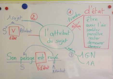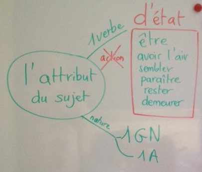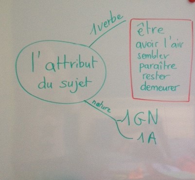 Pour l’attribut du sujet , nous avons réalisé une carte sur un tableau blanc : Léo avait sa leçon sous les yeux et nous avons donc noté ce qui était important à savoir sur l’attribut du sujet à partir de 2 questions :