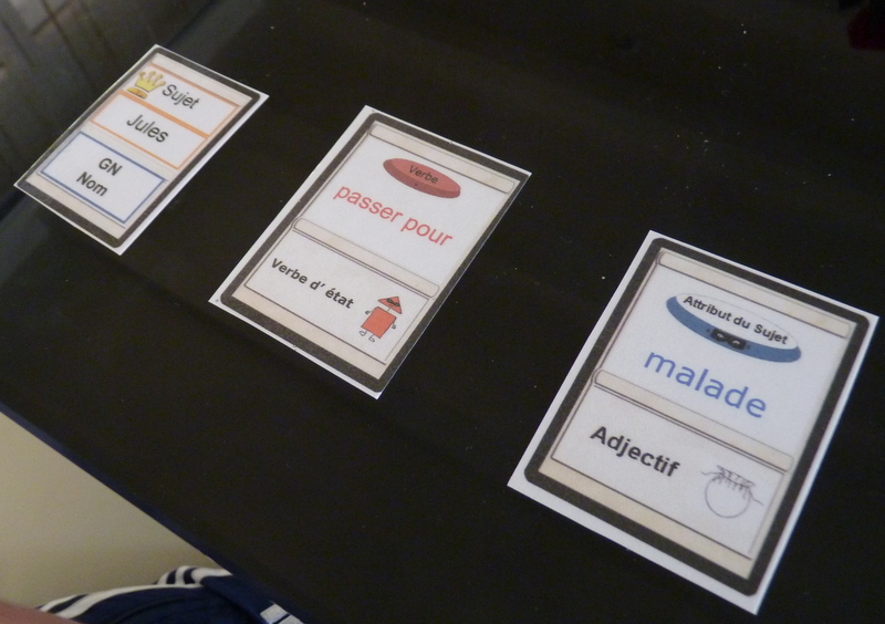 Aujourd’hui , nous allons jouer avec des cartes ( au départ avec les cartes du jeu 1001 phrases puis des cartes ajoutées – trouvées chez Troublesneurovisuels ici et – et d’autres que j’ai fabriquées avec cette base – à télécharger ci-dessous). La règle sera simple : on pioche 3 cartes : une carte sujet, une carte Verbe d’état et une carte attribut du sujet . On doit inventer une phrase avec ces 3 cartes ( même si elle est un peu « bizarre) , l’écrire et par la même occasion faire les accords ….. (toute une histoire ….). Nous veillerons en même temps à faire repréciser la nature (de chaque carte) et la fonction.