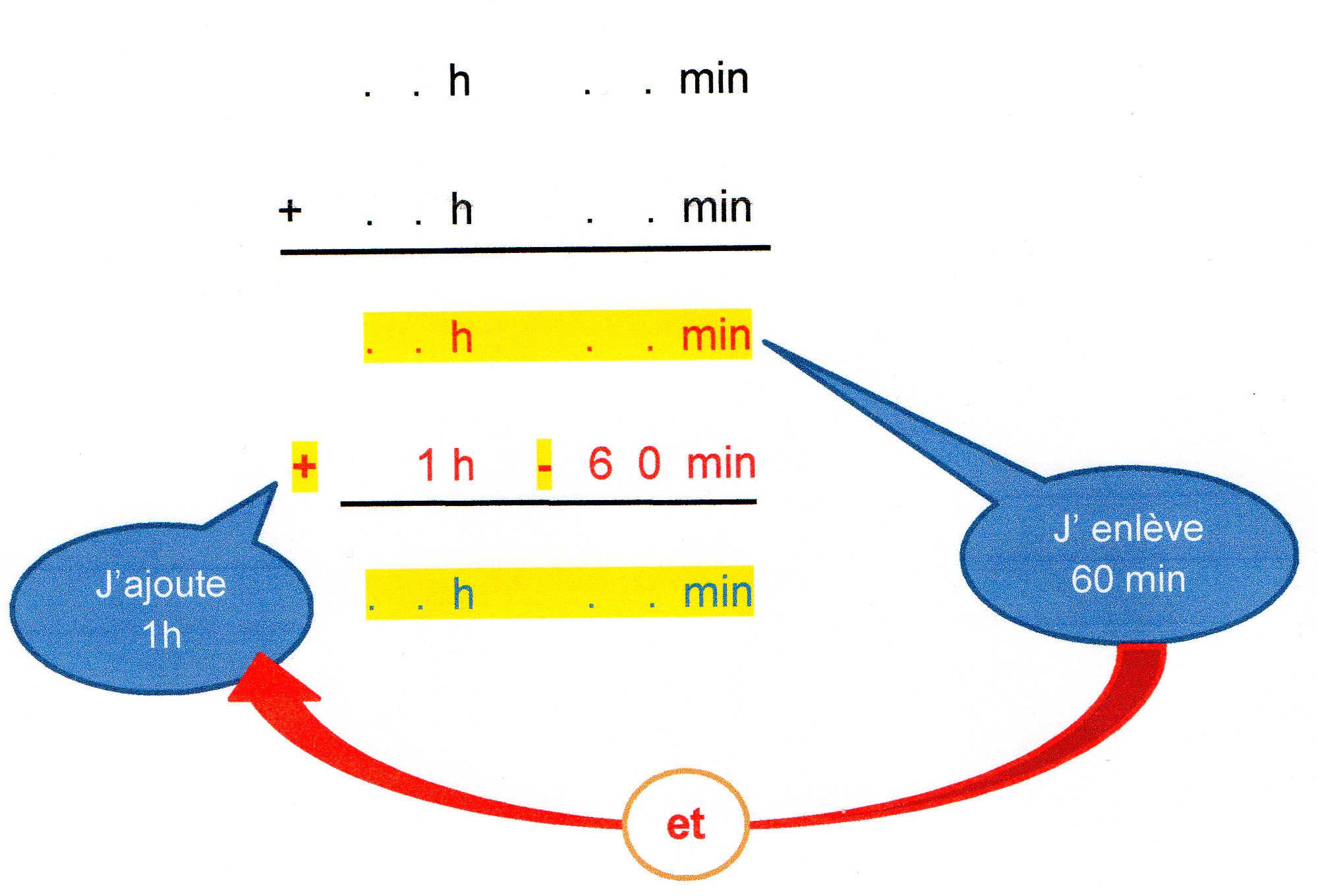 Problème n° 1 : problèmes d’heures, de durées / Transformation d’un état : recherche de l’état final avec 2 problèmes de référence ( selon si le nombre de minutes est supérieur à 59 min ou non)