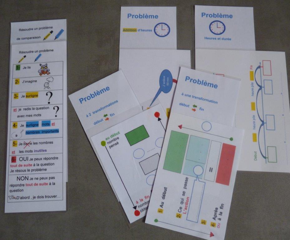 • n° 5 : les problèmes actuellement la fiche méthode « résoudre un problème » et d’autres fiches plastifiées (issues de notre recherche sur le classeur de problèmes résolus) sur les problèmes d’heures ….  Quand possible, repérage par une image et un titre avec rappel du mot problème ( pour un rangement plus facile aussi).