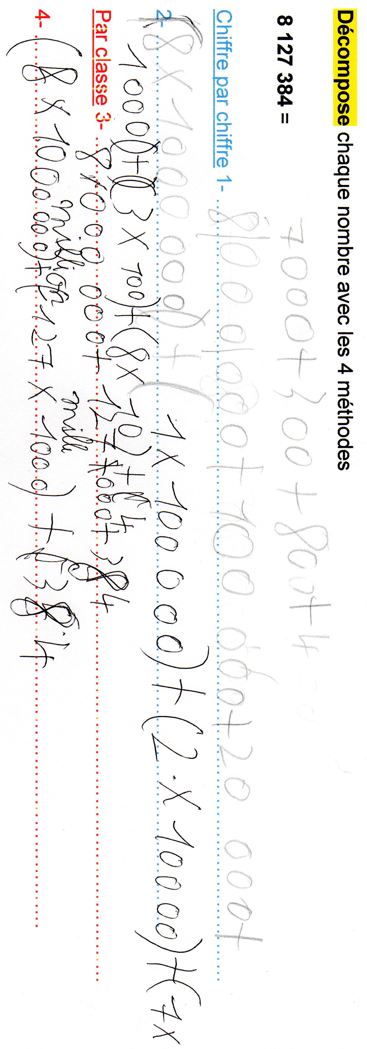 1- feuille faite ce matin (en ma présence) : décomposer 3 730 217 ( de 2 manières différentes) : Léo a choisi la méthode avec les multiplications (de type 2 et 4)