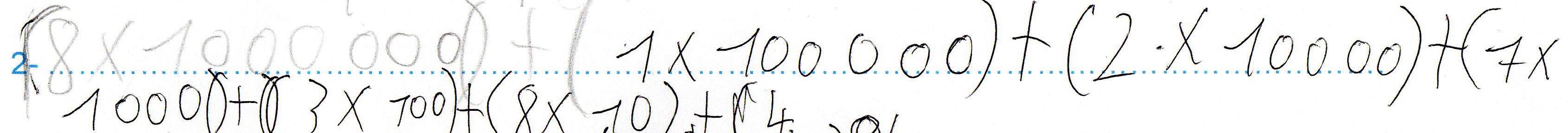 - Sa préférence va vers la décomposition avec multiplications (dans les 2 méthodes) même si parenthèses et signes + (surtout oubli possible même si dit oralement) sont « coûteux » , et qu’il est obligé de recompter son nombre de zéros (même si le petit trait qu’il trace l’aide)