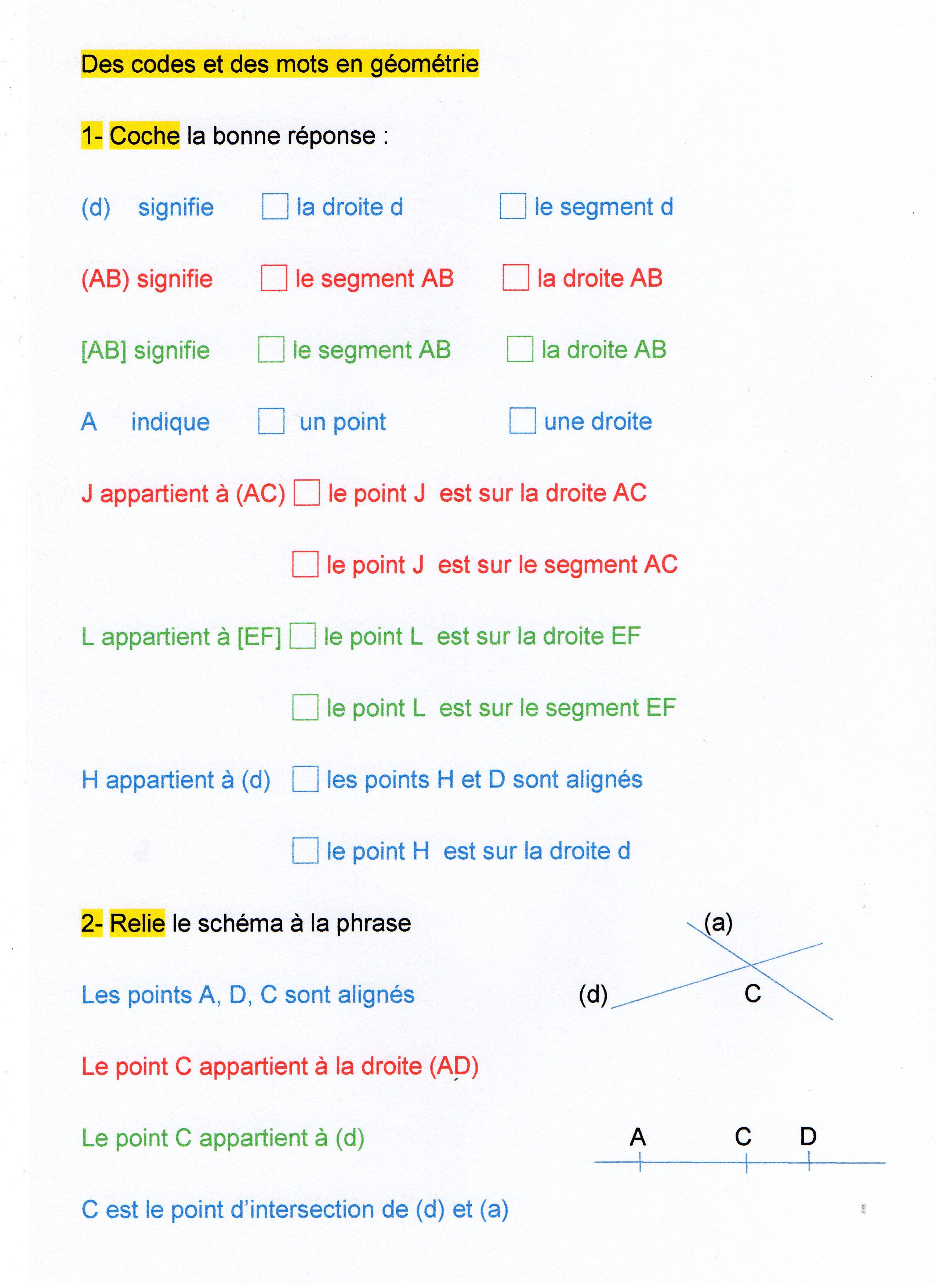 Remarque : la cage et le ballon sont les 2 astuces de l’ergo : cage pour le segment et ses crochets, ballon qui roule pour la droite et ses parenthèses (déjà 2 obstacles à surmonter) sans compter qu’on passe aussi en écriture « script majuscule » et que les droites avec leur « petit d », d’ ou d1 » vont aussi nous jouer des tours . Voilà encore des difficultés « graphiques » cachées sous des notions de géométrie qui vont encore demander une attention particulière à l’enfant dyspraxique …….