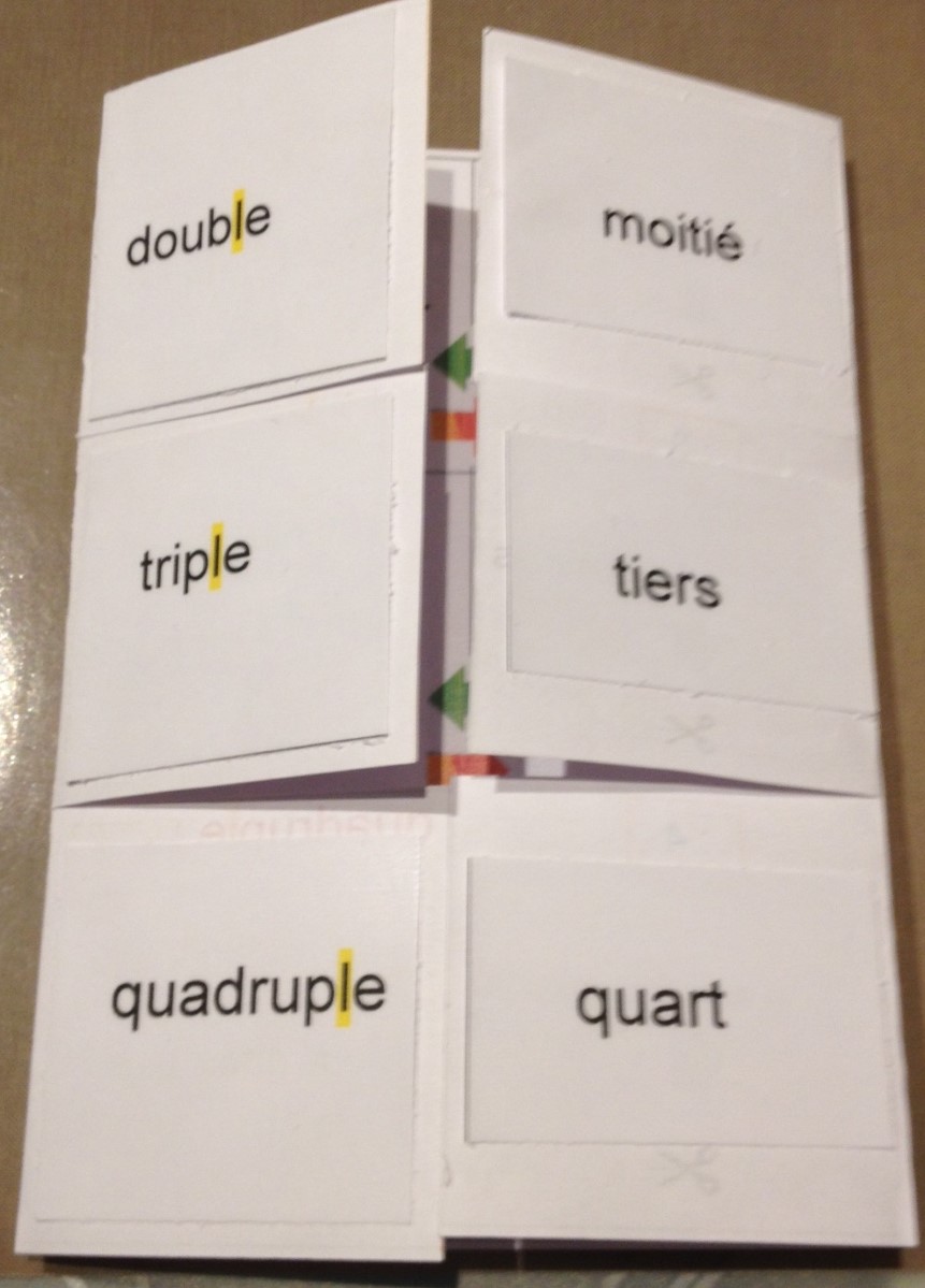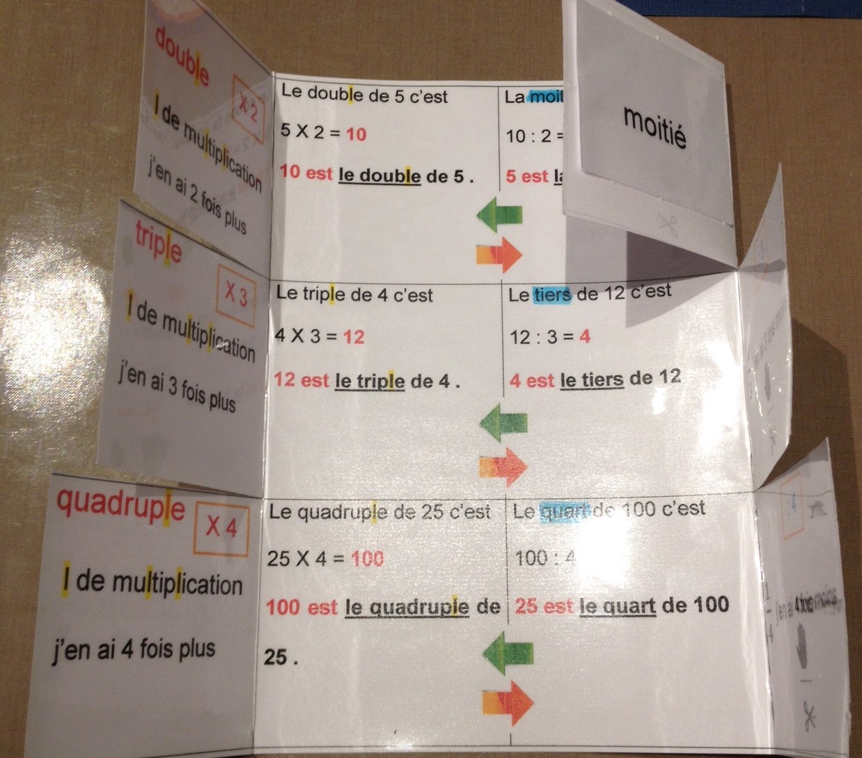 J’ai fabriqué un outil de « lecture/évocation » de ces mots (que l’on a utilisé seulement à la maison) et que l’on regardera à nouveau (si besoin) par exemple pour s’entraîner à résoudre des petits problèmes de type : »Aurélie a 45 €, son grand frère possède le tiers de sa somme et son petit frère en a le double. Calculer la somme d’argent que possède chacun de ses frères « . Ici en images :