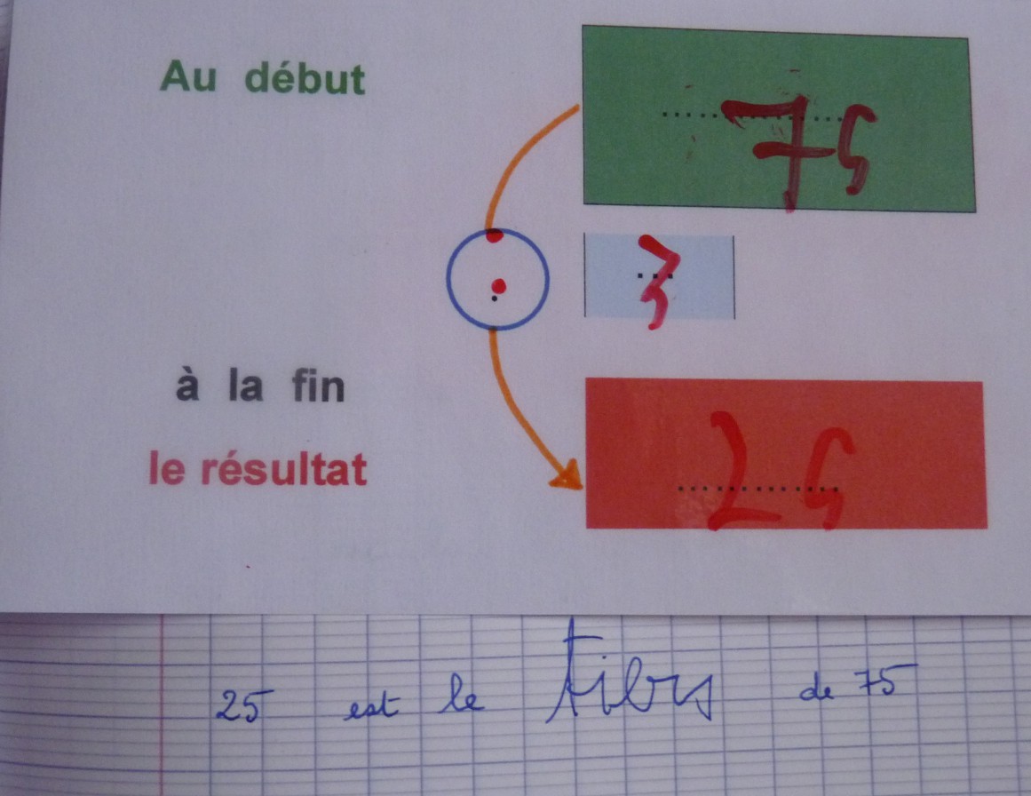 2. où se trouve le plus grand nombre ? (ici case verte) (pour amener la réflexion vers : donc pour obtenir le résultat on va diviser)