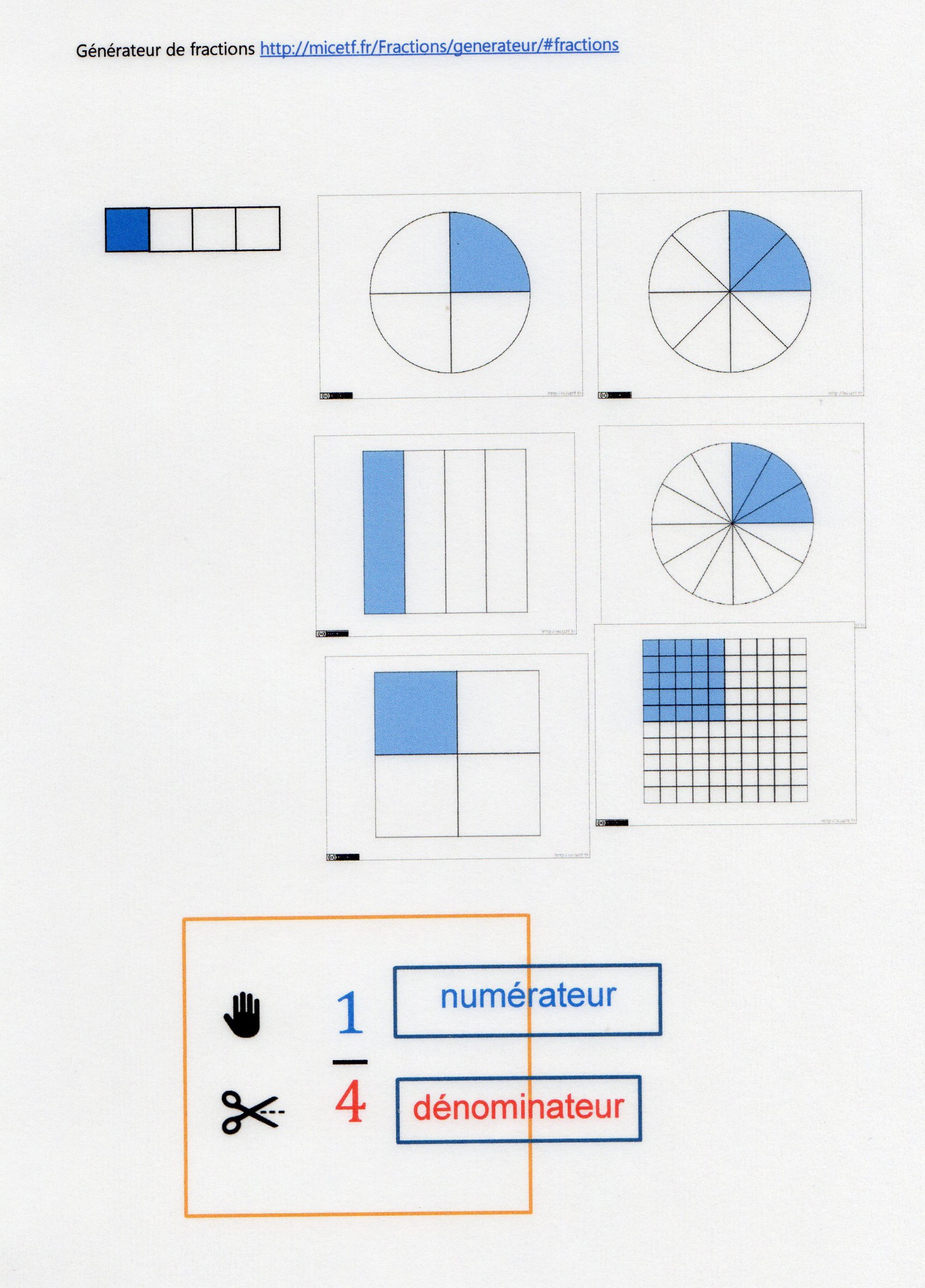 Un générateur de fractions « magique » ici (pizza, quadrillage ….)