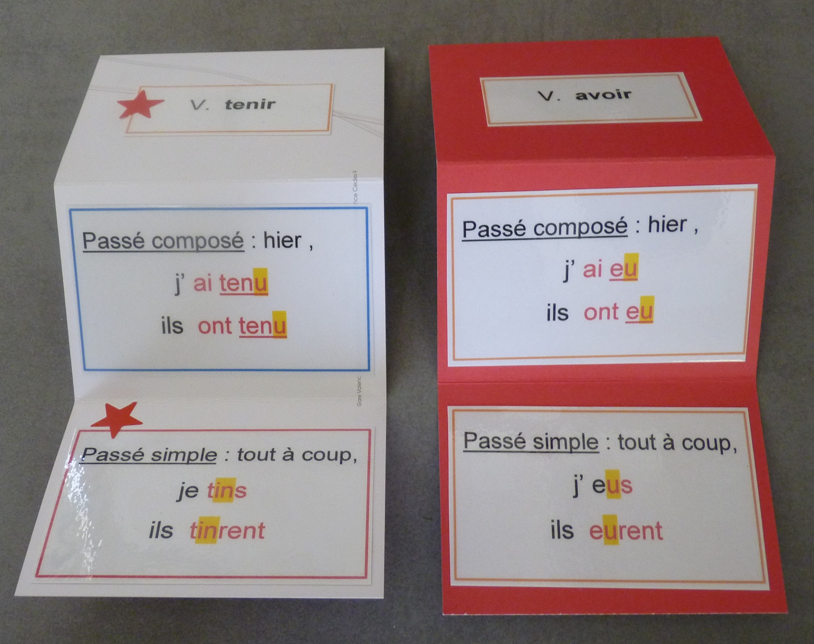 • Voici un exemple de cartes confectionnées et à déplier avec les verbes suivants : lire, venir, écrire, mettre, croire, courir, voir, vivre, pouvoir, être, faire, savoir, prendre, dire, tenir, avoir. Une carte possèdera une étoile rouge lorsque la règle n’est pas suivie (comme pour le verbe VENIR ou TENIR )