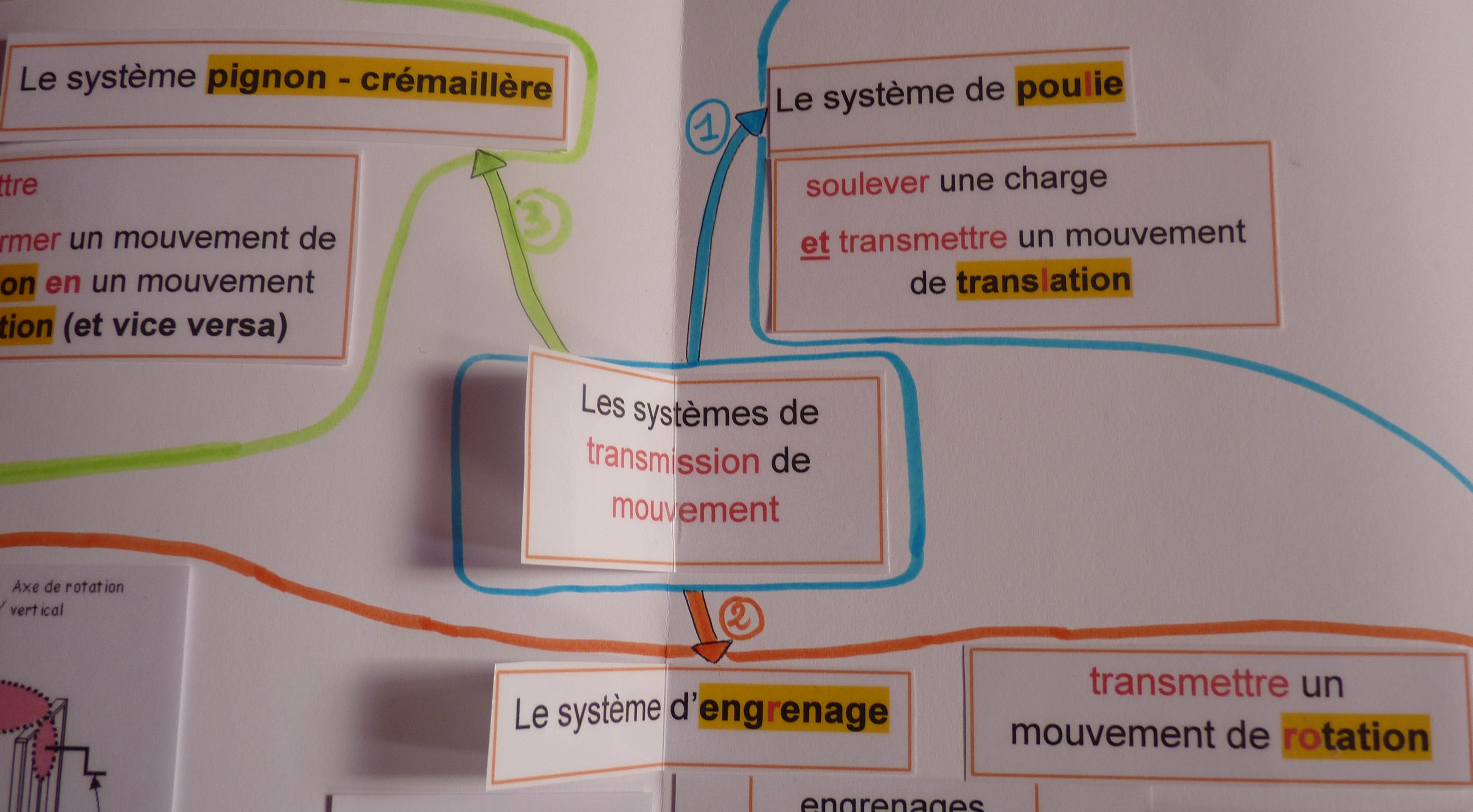- Après chaque système, on a pris le temps , souvent yeux fermés, de se redire ce qu’on apprenait ( C’est le système de ….. , il te fait penser à quel objet ou quelle image te vient dans la tête ? Il est composé de …. , Il permet de ….. ) pour l’installer dans sa mémoire avec les mots JUSTES ……(des Verbes : transmettre, transformer, soulever … des noms : la rotation, la translation …..) même si Léo explique quand même dans ses mots, j’ai demandé de la précision .