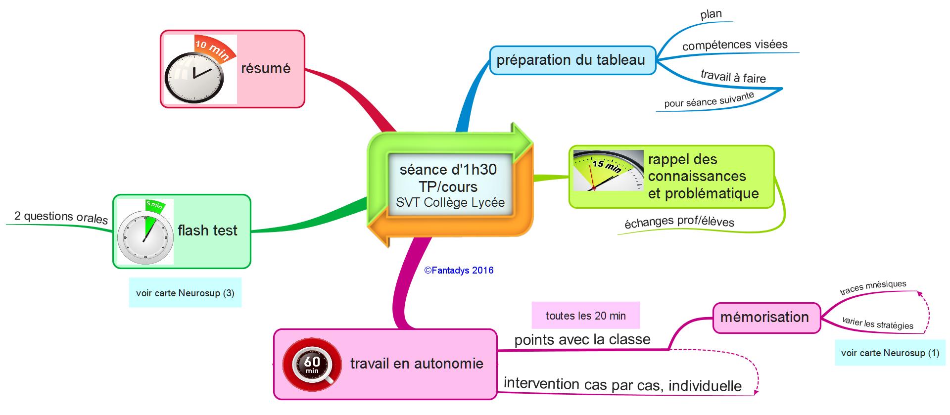 Puis, ensemble, nous avons résumé en carte ce qu’il va essayer de mettre sur pied en classe à la rentrée au lycée notamment prendre le temps de la mémorisation (branche 3), une étape souvent « oubliée » et pratiquer le « Flash test » . Quant au reste, il fonctionnait déjà ainsi. Ce type de plan de séance peut tout à fait fonctionner en collège en SVT …. à adapter selon la matière