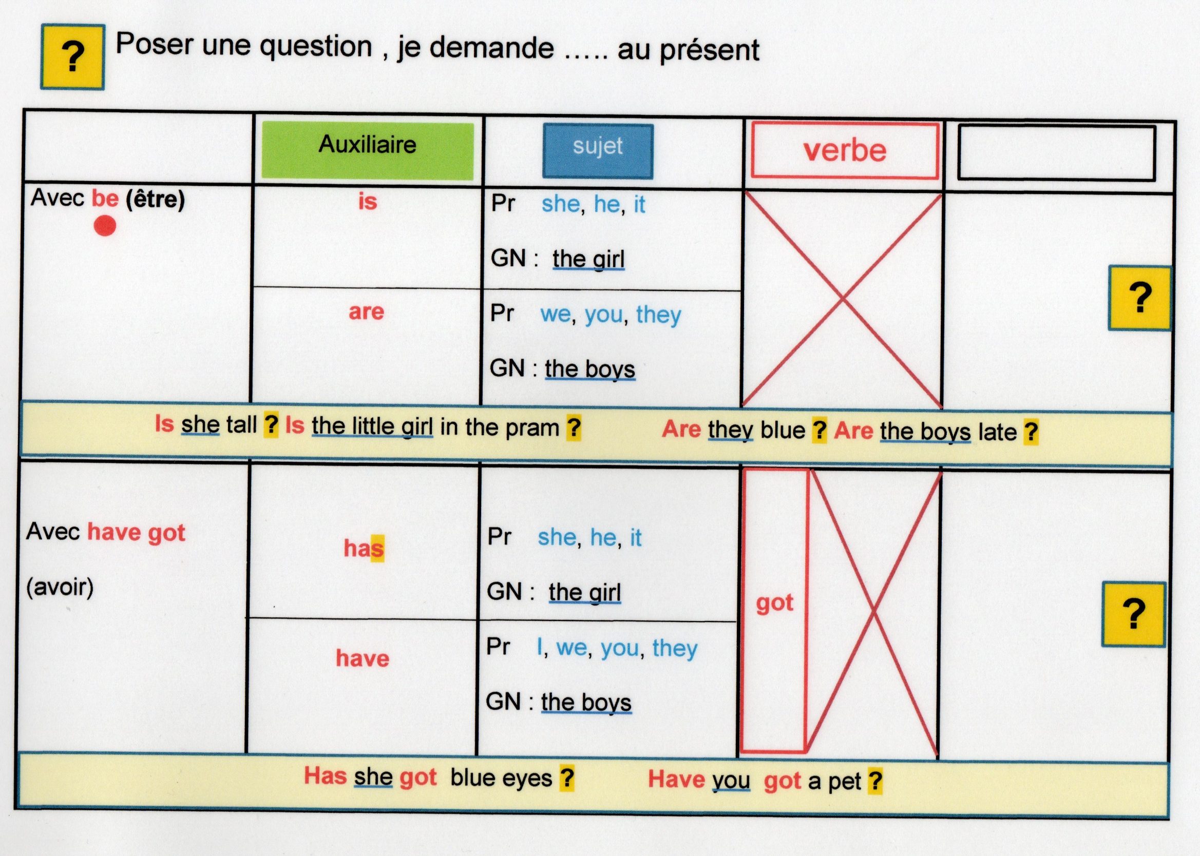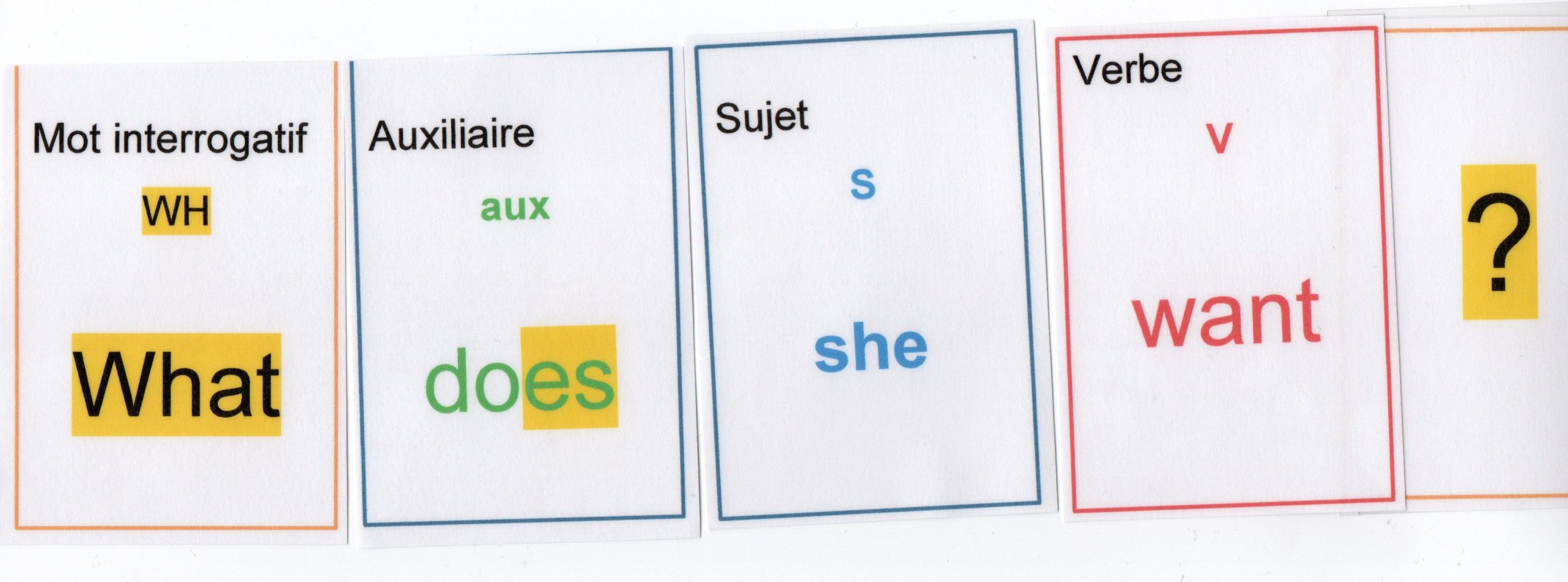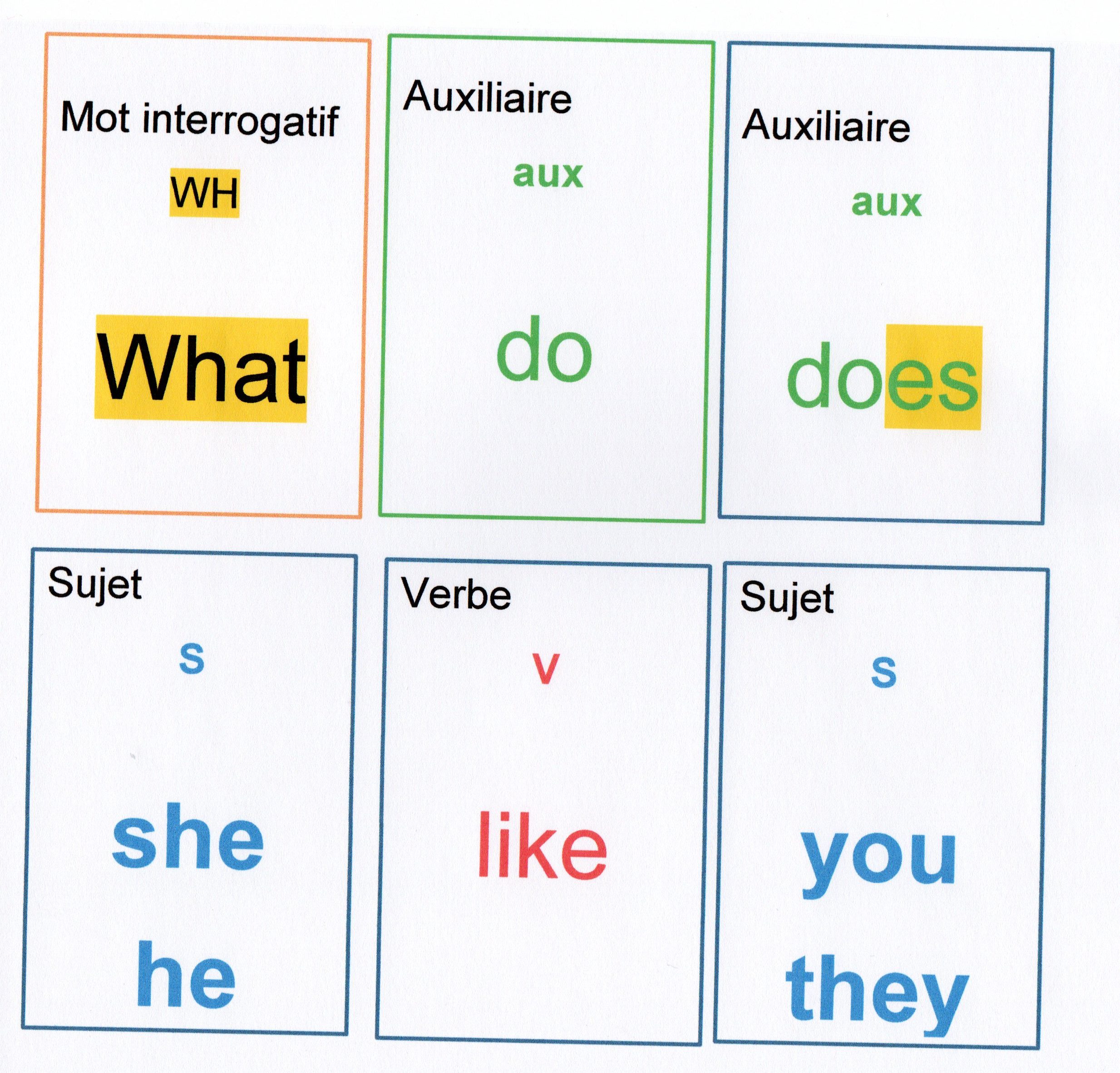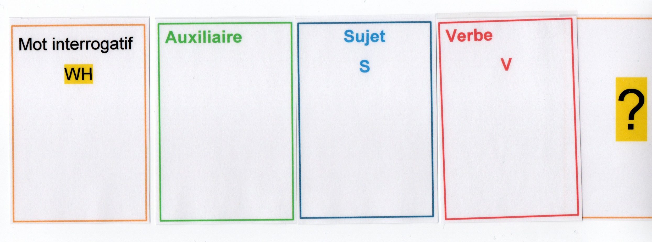 - Reprise de l’ordre des termes (comme dans les tableaux ci-dessus) : on peut d’ailleurs travailler les « yes-no questions » comme les « WH questions ».Nous garderons sous les yeux ce schéma tant que ce sera nécessaire (du moins à la maison ….)