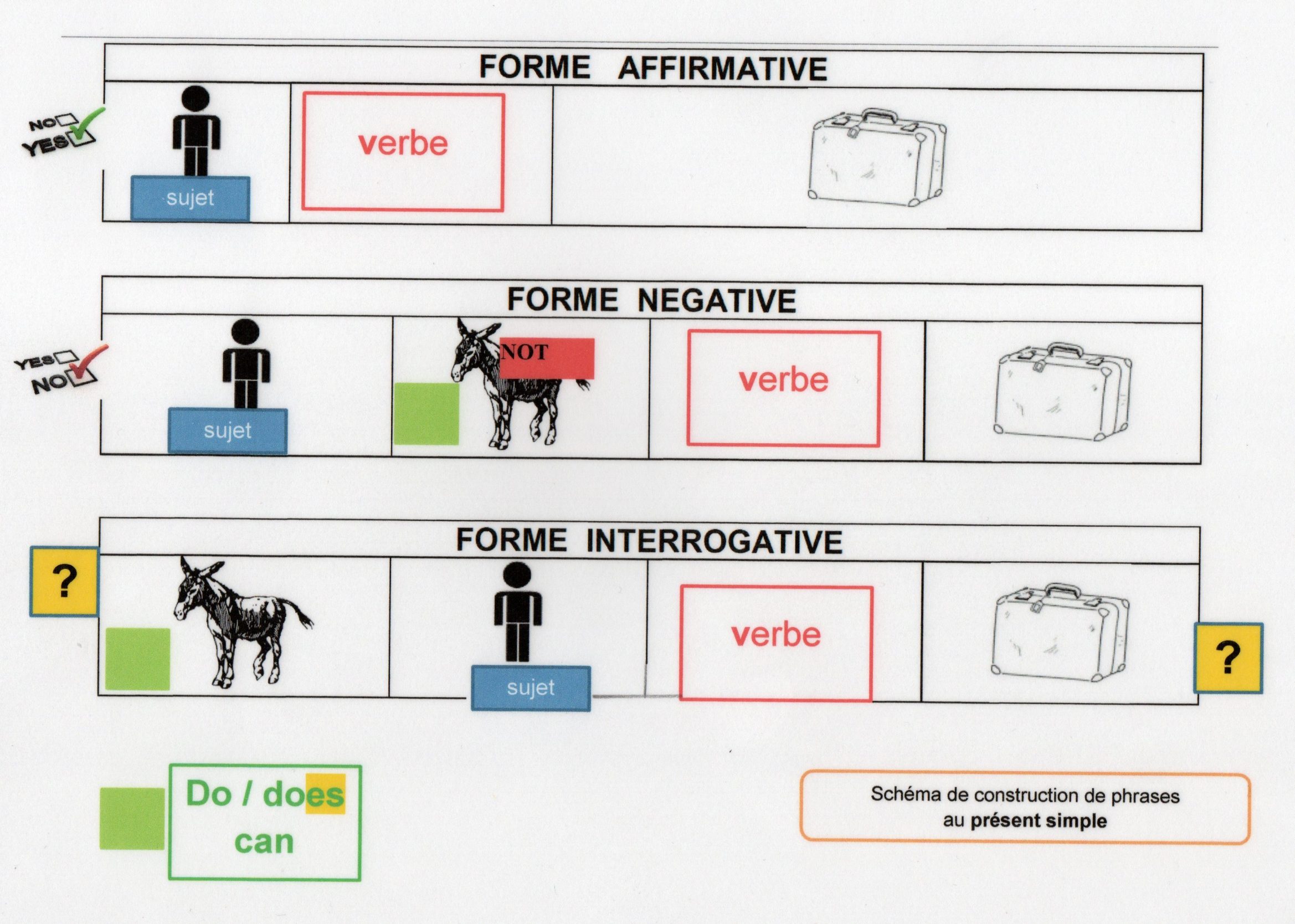 Schéma(s) de construction de phrases au présent simple : (j’ai utilisé le travail déjà proposé avec de petits ajouts)