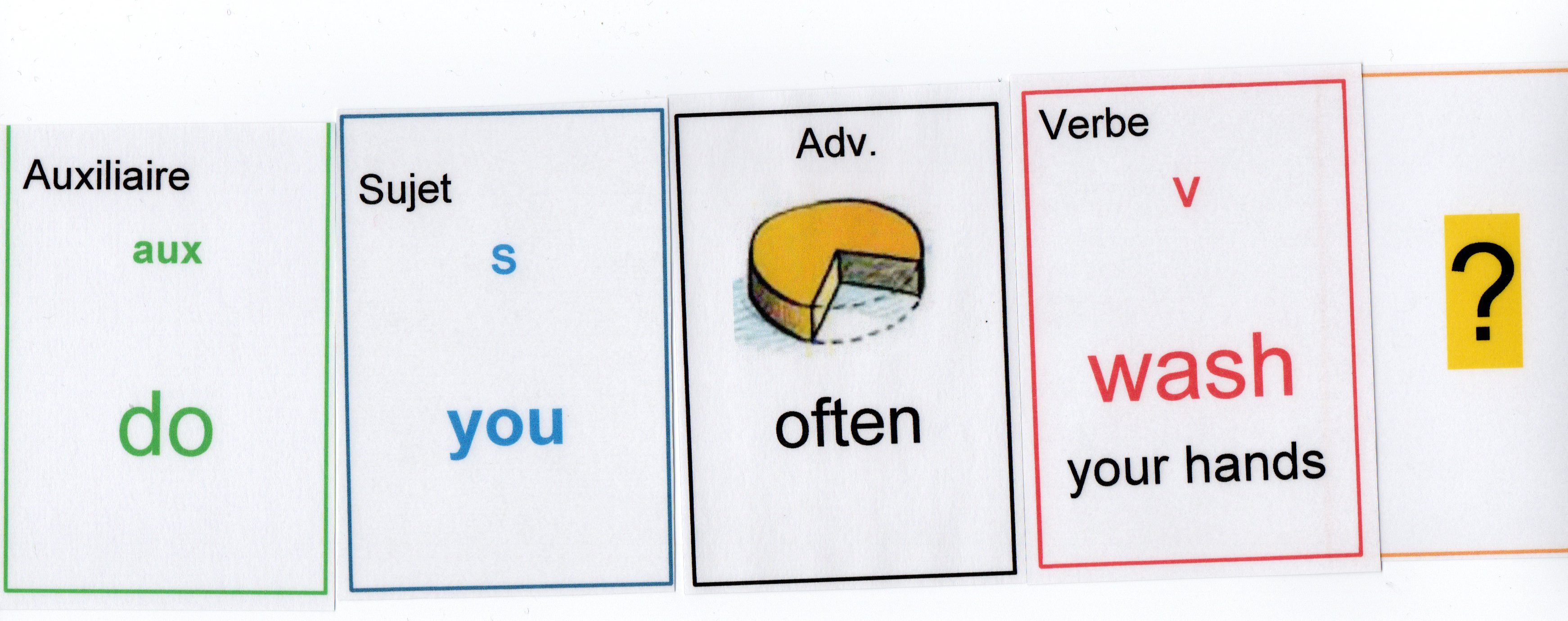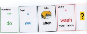 Il ne nous reste plus qu’à inventer des phrases affirmatives et interrogatives en particulier ….. en manipulant les cartes , en utilisant le vocabulaire appris ou à apprendre, en en créant quand nécessaire ….