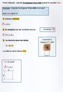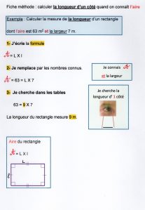 Là aussi , nous avons mis en place une « procédure » à partir de la méthode donnée en classe : 2 cas de figures : trouver la longueur d’un côté d’un carré dont on connaît l’aire (la plus facile ? ) , trouver la mesure de la longueur dans un rectangle dont on connaît l’aire ( la plus difficile ? Finalement pas forcément car les tables sont très bien sues et facilement transférables ….) . Les 2 procédures en image :