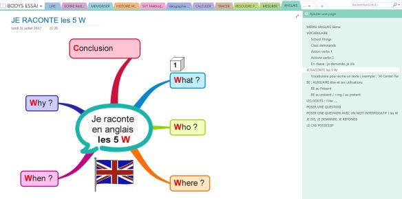 Même « technique d’écriture » qu’en français (expliquée ici) : quelques mots tapés sous OneNote au niveau de chacune des 5 branches W PUIS mise en phrase directement tapées au-dessous. Comme en français, Léo barre au fur et à mesure les informations écrites.