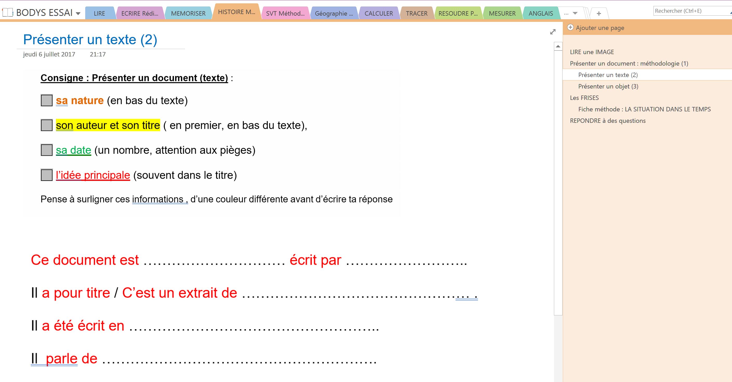 - Puis, nous allons rechercher l’outil « présenter un texte » dans la Bodys (2ème page ) et le coller dans la page OneNote pour le remplir (ici au stylet ou au clavier au choix)