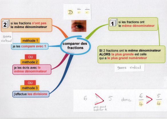 J’ai donc ajouté ces petites astuces dans la carte de la leçon « Comparer des fractions » et nous avons enfin pu attaquer (à proprement parler) les différentes stratégies de comparaison de fractions vues en cours : vocabulaire , procédure ou démarche à suivre , savoir choisir ou décider de la méthode (sauf quand l’énoncé de l’exercice exige une méthode précise), faire expliquer, « verbaliser » la méthode et ses différentes étapes ……