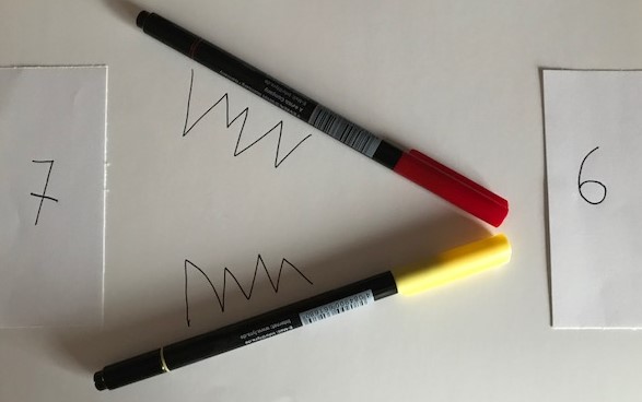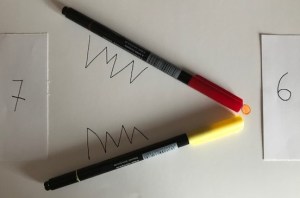 - on est passé par la manipulation : passer de = à > (avec des feutres!) , on a ajouté un point pour le départ des branches et des « dents » (finalement , pour s’amuser, Léo les a reproduites) ….. [peut être une nécessité pour pouvoir automatiser … et tant pis si c’est du niveau CE1 !…..].