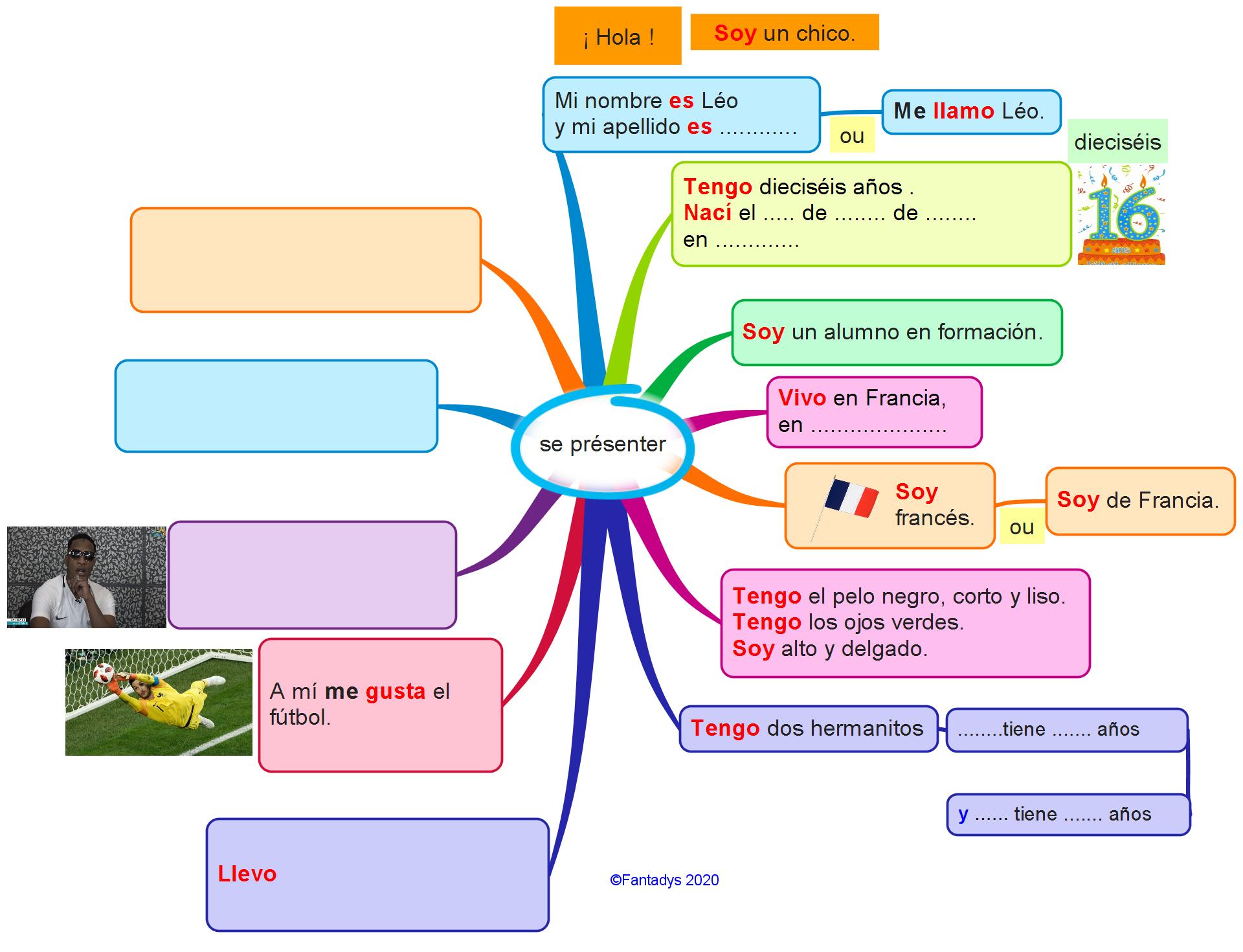 J’ai été surprise qu’il restait pas mal de choses en mémoire et c’est à partir d’une carte mentale de présentation ( comme cela a été fait cette année en 3ème en anglais) que nous avons recherché les « infos » principales à connaître pour se présenter et/ou répondre à des questions simples sur son identité , la famille, les goûts, les loisirs …. L’idée est d’ensuite passer à la présentation de joueurs de foot espagnols (bien connus) en suivant la même démarche (et en passant à la 3ème personne !)