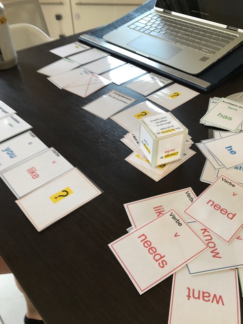 Il ne nous reste plus qu’à inventer des phrases affirmatives et interrogatives en particulier ….. en manipulant les cartes , en utilisant le vocabulaire appris ou à apprendre, en en créant quand nécessaire ….