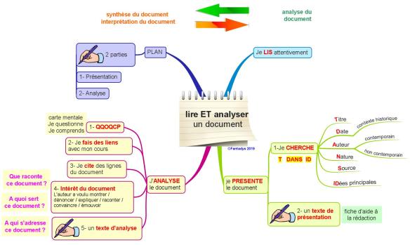 – Nous avons essayé (en parallèle ou à la place de la méthode pour lire et analyser un document) de travailler à partir d’un tableau . Voici en carte mentale la fiche méthode ainsi qu’un exemple « type » de tableau à construire et/ou compléter (travail à l’essai):