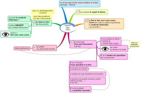 - sur le repérage des différents documents : quelles questions vont avec quels documents ? comment je m’y prends dans ces 6 à 8 feuilles du brevet blanc d’histoire/géo/emc ? comment ne pas « sauter » une question ? ( Léo a même sauté la partie « histoire » : il n’a pas réussi à « voir » le sujet et a répondu à une question d’EMC sur un document de géo ……) . Nous avons repris ce travail du « comment je m’y prends, du repérage des différents documents …. Aura-t-il besoin de l’aide d’un « lecteur » ? Voici une carte que j’ai essayé de lui proposer après avoir analysé ensemble ce qui s’était passé (la carte est faite pour préparer une procédure mais Léo n’aura pas besoin de l’utiliser par la suite)