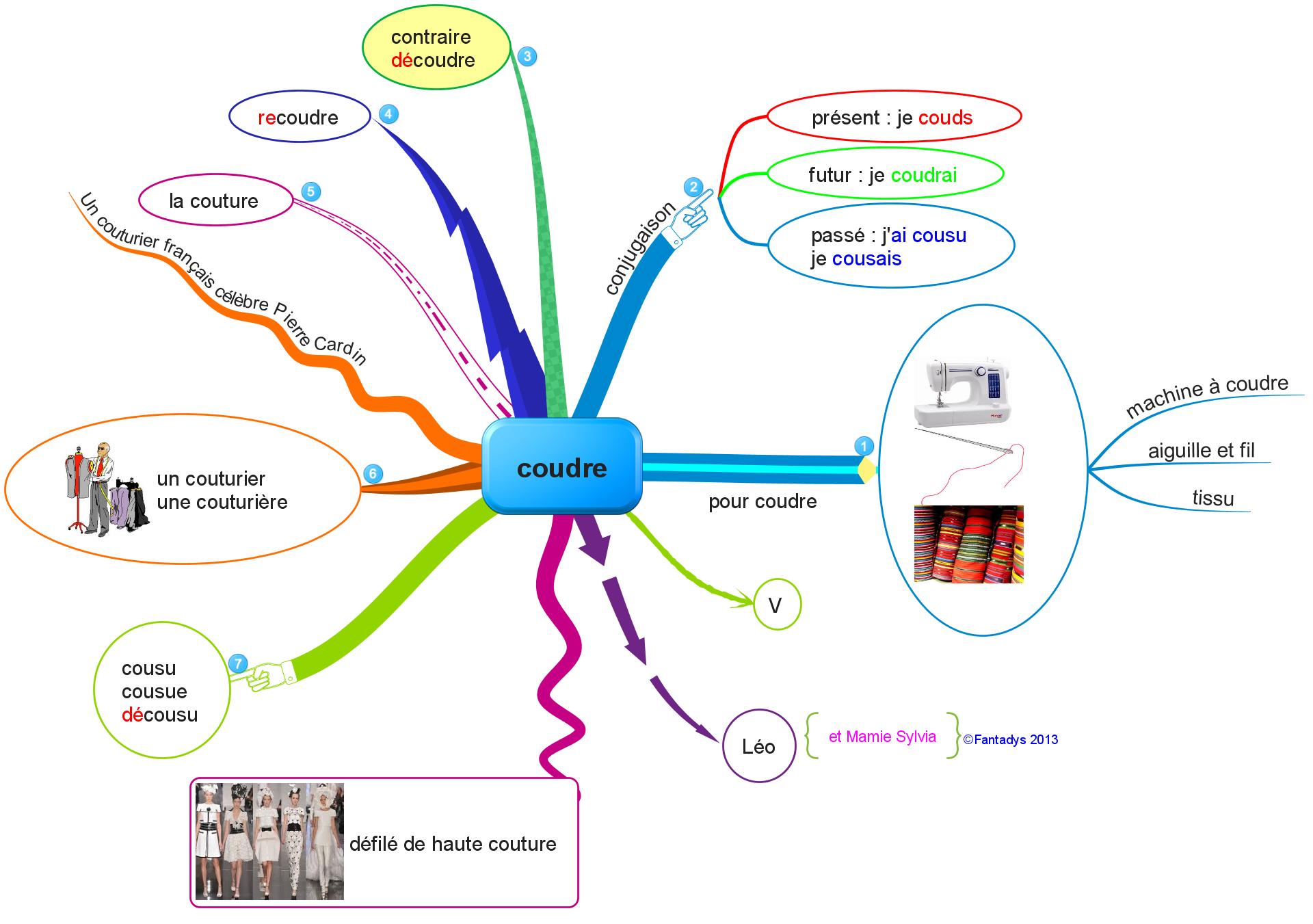 - Léo attend les remarques avec impatience ….Pour ma part, je lui ai déjà dit que , maintenant, c’est lui qui fera les cartes !Et j’ai accepté sa demande : c’est toi qui les fais au propre …. ce que j’ai fait … Voici donc la nouvelle carte du verbe coudre signée Léo.
