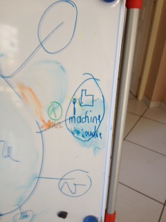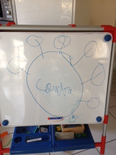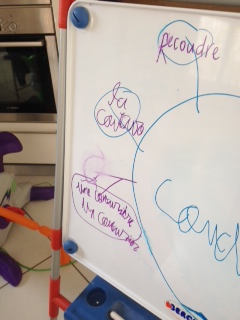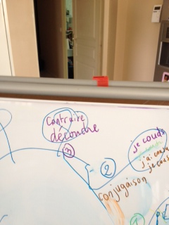 - 2ème bulle : il est parti en sens inverse des aiguilles d’une montre et indiqué le n° 2. Il a seulement à ce moment jeté un coup d’œil sur l’ancienne carte et a dit : « là on va mettre la conjugaison (je couds, je coudrai …. ) ». On respectera les couleurs déjà utilisées en conjugaison : rouge pour le présent …. Mais, n’ayant pas les bons feutres pour tableau blanc, nous changerons les couleurs pour la mise au propre.
