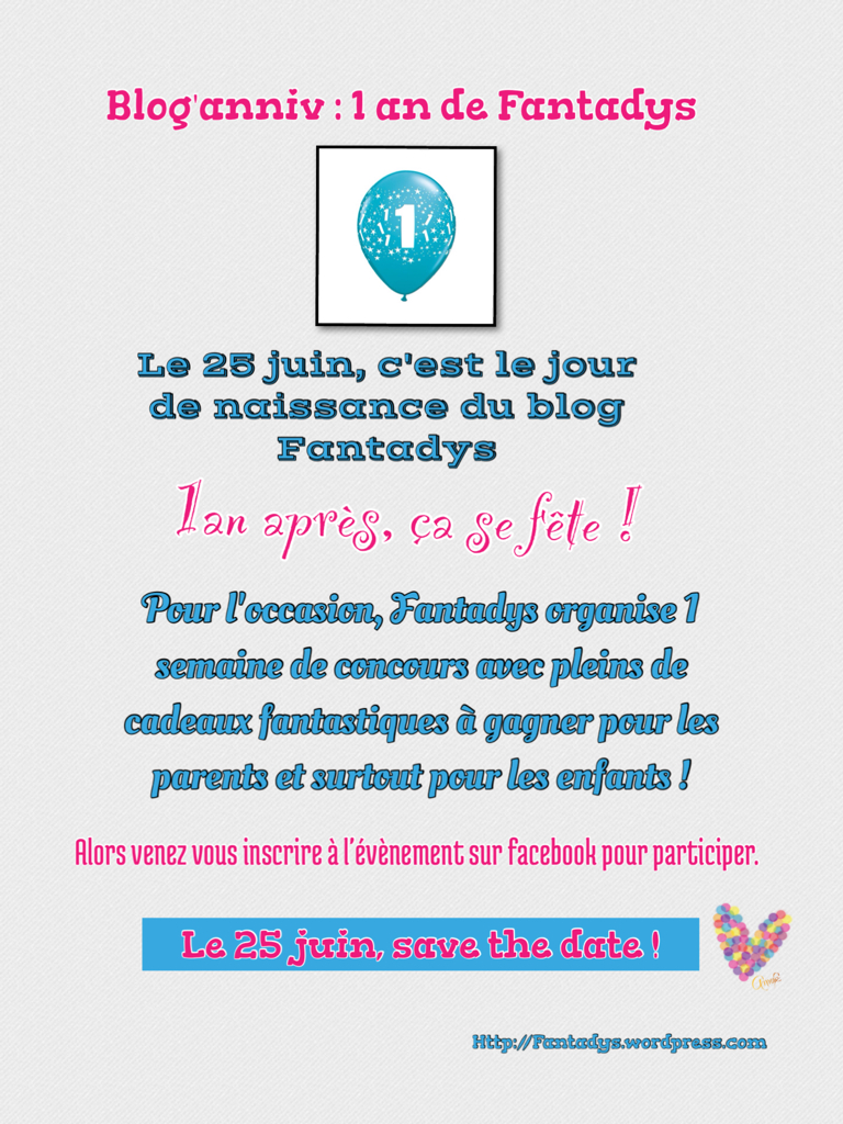 Le concours débute le 25 juin 2014 et se termine le 6 juillet 2014 à minuit. Une fois les gagnants annoncés, vous aurez 7 jours pour confirmer par mail vos coordonnées à l’adresse : fantadys@yahoo.fr, sinon le lot sera remis en jeu et un nouveau tirage au sort aura lieu.