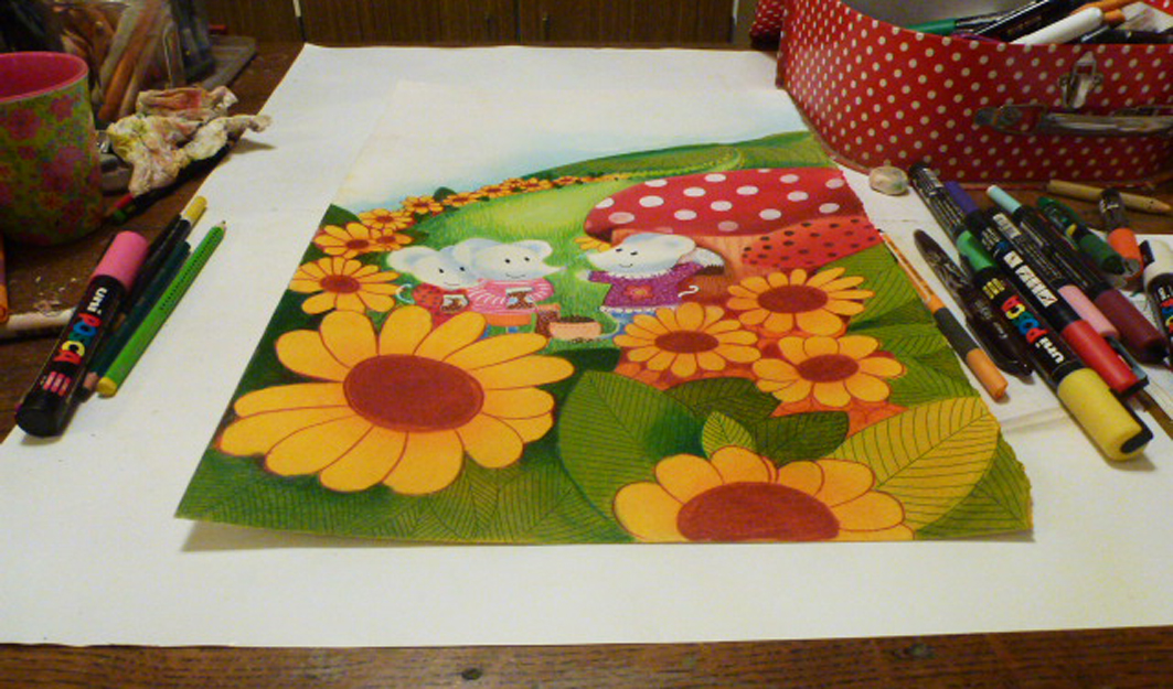 J’ai commencé par monter mon blog en 2007 où je mettais mes illustrations du jour, ou mes tableaux d’expo. Et puis de réseau en réseau, Karine Quesada (auteur aujourd’hui de 5 de mes livres) m’a contactée un jour en 2008 pour monter un projet d’album «J’aime ma maman» pour un concours «ouvrez les livres aux bébés» du conseil général du puy de Dôme. Nous avons fait le livre en entier, j’ai fait une maquette et envoyé le projet. Nous avons mis quelques pages sur nos blogs…et là, MIRACLE ! un éditeur nous a contacté… puis un deuxième ! Nous avons donc dû choisir, entre ces 2 éditeurs et le concours. Et voilà, «J’aime ma maman» est sorti en 2009 suivi de «J’aime mon papa». Et depuis 2009, effet boule de neige… j’ai maintenant une vingtaine de livres réalisés et je n’ai pas du tout envie que ça s’arrête, malgré les hauts et les bas de ce métier.