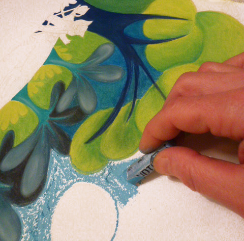 Quant à ma technique, je reste fidèle au dessin. J’utilise donc du pastel sec que j’étale du bout des doigts sur le papier. Les couleurs mélangées, je fixe et je reviens travailler par-dessus avec des feutres et des crayons. Une technique très très personnelle et pas du tout académique ! Parfois sur mes tableaux, je colle du papier, ou de la vieille tapisserie. J’aime vraiment sentir le papier sous mes doigts. Je fais un peu de numérique, j’aime bien aussi, mais j’en fait tellement à mon travail que le soir j’ai besoin de retrouver mes pastels et surtout d’en avoir plein les doigts !
