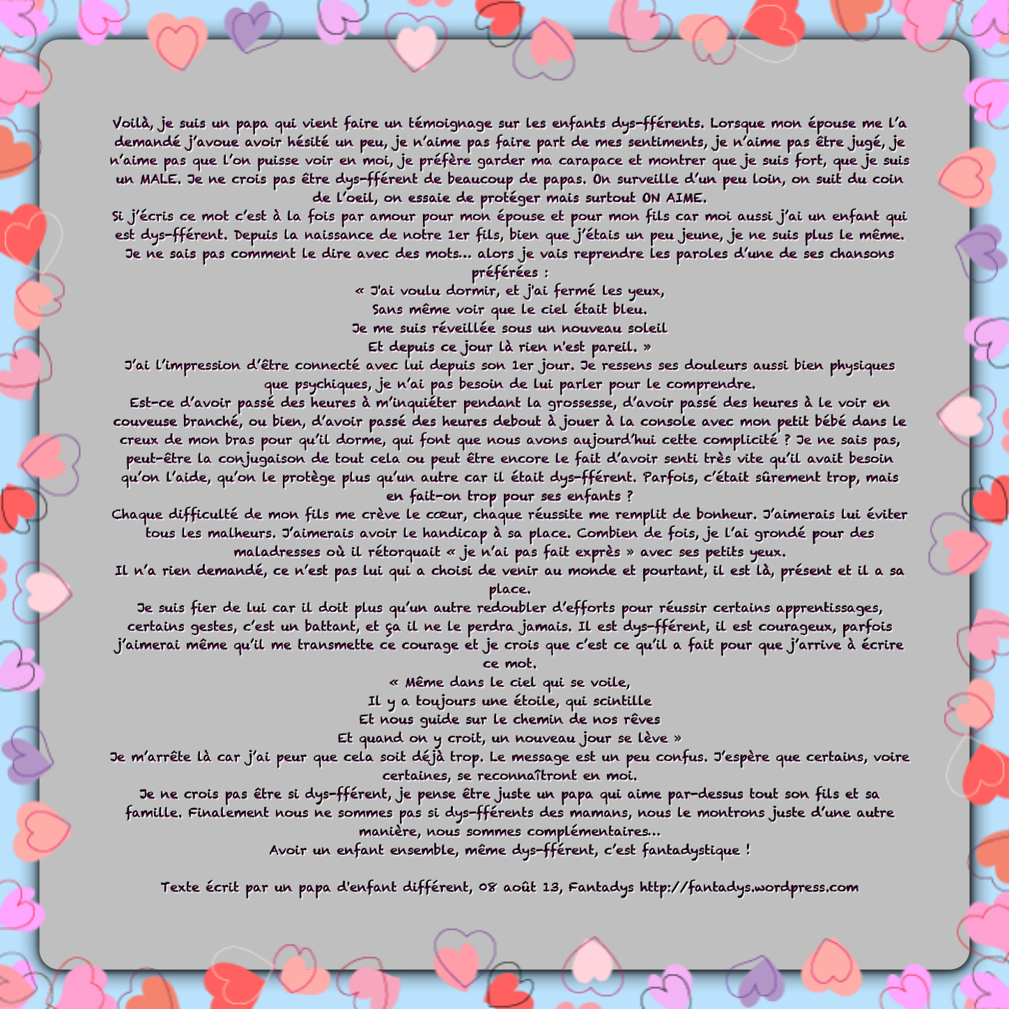 Je suis fier de lui car il doit plus qu’un autre redoubler d’efforts pour réussir certains apprentissages, certains gestes, c’est un battant, et ça il ne le perdra jamais. Il est dys-fférent, il est courageux, parfois j’aimerai même qu’il me transmette ce courage et je crois que c’est ce qu’il a fait pour que j’arrive à écrire ce mot.