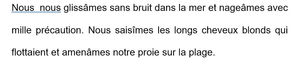 – je fais maintenant les repérages dans le texte : en utilisant les mêmes surligneurs. Attention aux accords : si on change un sujet , il faut chercher le verbe par exemple ; si on change un nom, on regarde le GN complet et sa fonction (est-il sujet ?) ……. C’est toute une « gymnastique » à effectuer …. Parfois, les réponses sont trouvées me semble-t-il « à l’intuition », alors je demande la justification ……