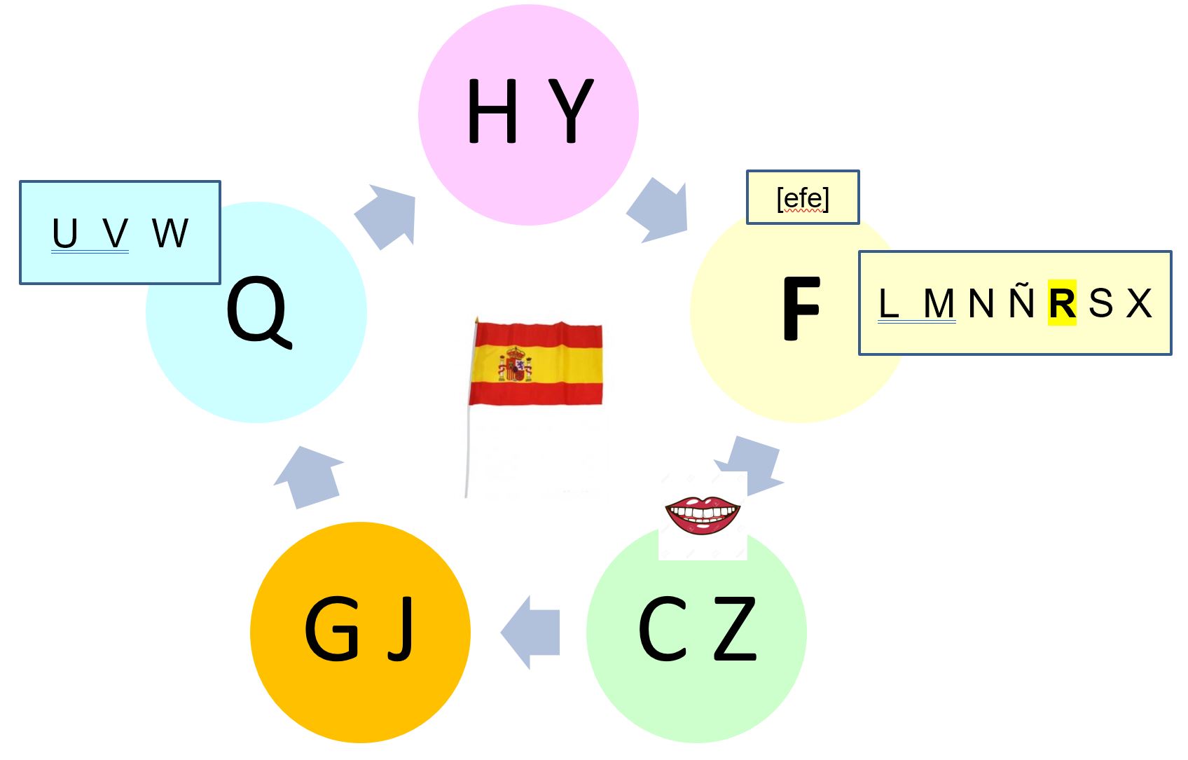 - On met de côté C et Z ( avec leur problème de « langue coincée ») et H et Y ( avec leurs particularités)