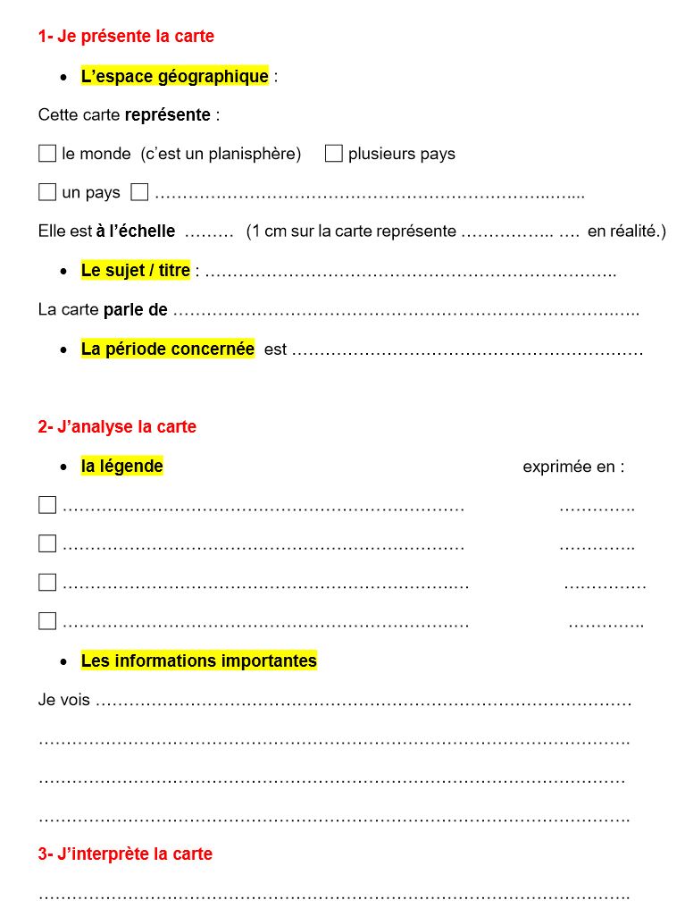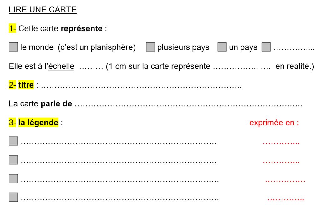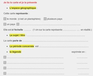 Remarque : nous avons essayé aussi de présenter une carte et sa légende avant de répondre à la question (doc 2 p 11 , question n°4 : extraire des informations d’une carte) en utilisant la méthode mise en place pour la lecture / présentation d’un document que l’on peut retrouver ici ou là lorsqu’il s’agit d’une carte ). Cela me semble permettre une lecture plus efficace de la carte pour en extraire les informations.
