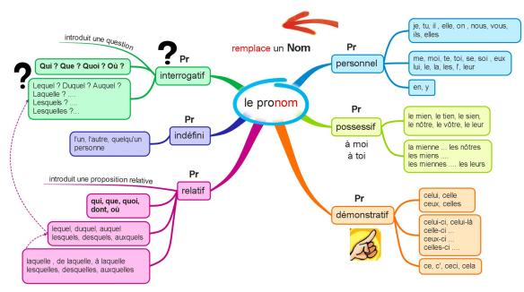 A la suite d’une demande, et n »ayant pas fait d’article sur les pronoms, je mets juste en ligne une carte mentale (la n°18 que l’on peut trouver ici ) et que l’on ne peut pas imprimer (j’ignore la raison !) …