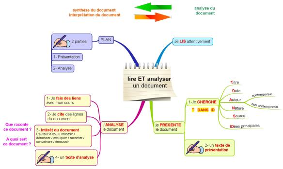 J’ai apporté quelques petites corrections dans la carte « Lire et Analyser un document » publiée ici en essayant d’utiliser une méthode pour « guider » l’écriture de l’analyse (partie la plus compliquée de mise en lien des connaissances et de l’apport du document) avec la carte QQOQCP publiée là.