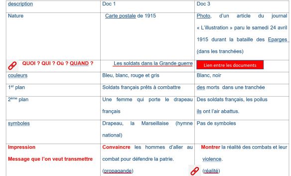 Remarque : En nous inspirant de ce travail sous forme de tableau, nous avons essayé de mettre en place une démarche pour la mise en lien de documents , à poursuivre …. Comment utiliser l’outil « tableau » pour présenter, décrire, analyser, comprendre le (ou les) message(s) transmis par un ou plusieurs documents : c’est un sujet qui m’intéresse tout particulièrement……