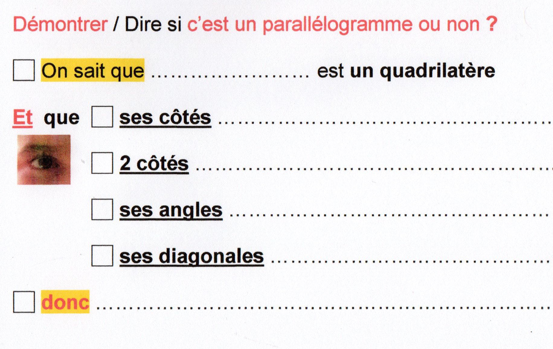 - Un détail : le « x » (l’inconnue à trouver) et le signe X peuvent être confondus (lors d’un moment de fatigue ou d’attention relâchée) , c’est vrai que le point d’interrogation nous arrangeait bien, [Léo écrivant d’ailleurs son « x » de la même manière que le signe X ….. Petit détail auquel on ne pense pas…. MAIS qui peut avoir son importance dans le cas de dyspraxie et dysgraphie …..] reste encore la couleur pour montrer que c’est le « x » que l’on cherche …..