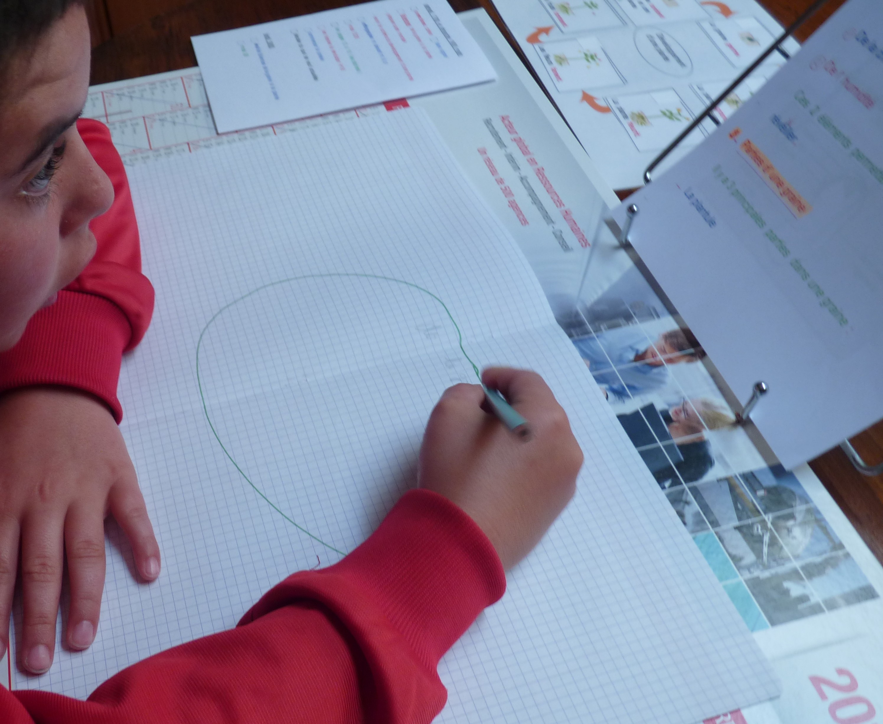 5- Relecture de la carte réalisée en faisant des phrases (quelques difficultés pour relire parfois ce qu’il a écrit mais là Léo compense par l’image et les légendes !)