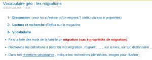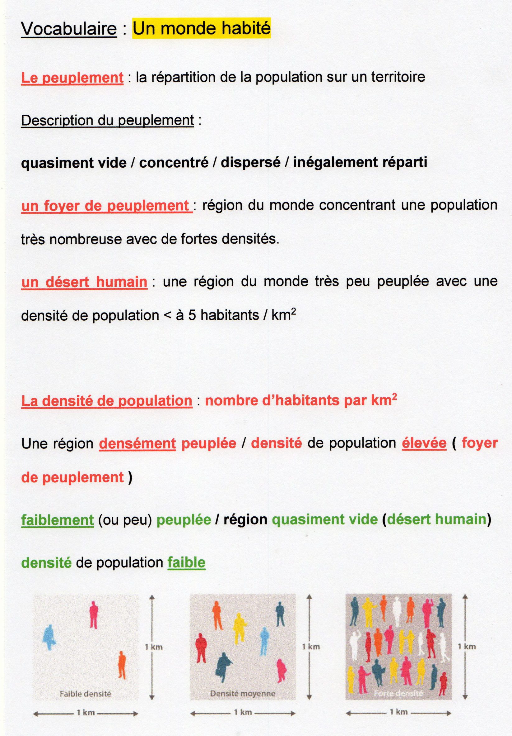 - au fur et à mesure de l’avancement de la leçon, création d’un vocabulaire « visuel » (si possible) : exemple fiche 1 « Un monde habité, la population mondiale »
