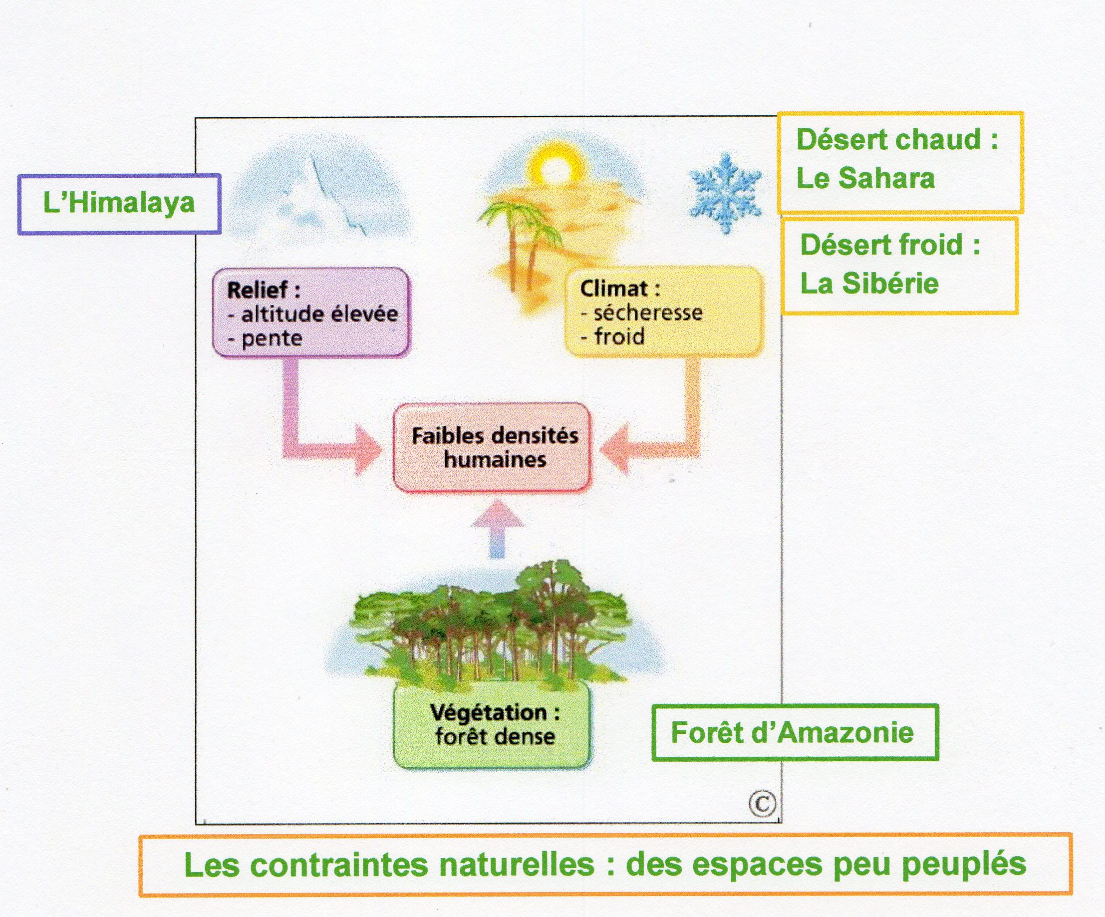 - des récapitulatifs « visuels » pour mieux comprendre : forte densité de population ou faible densité ? quelles explications ? (ceux-ci sont extraits de manuels ou de sites dont je ne me souviens plus le nom et que j’ai légèrement « modifiés »)