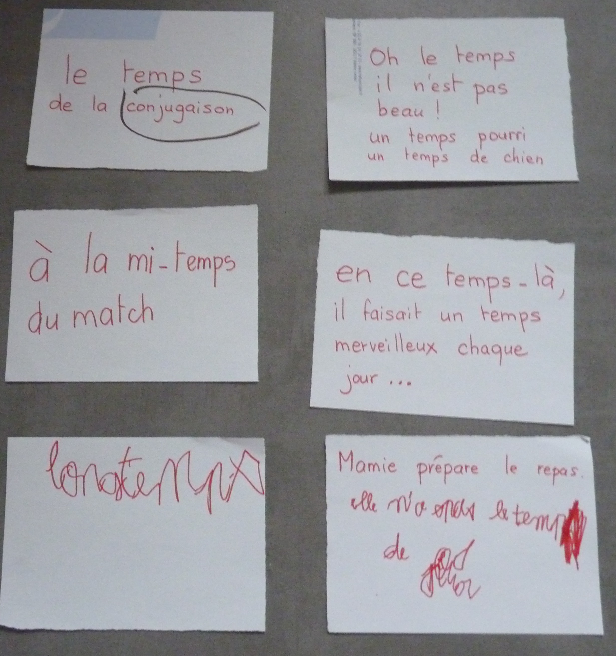 Ainsi , en fin de matinée, nous avions , dans le désordre les papiers suivants : longtemps, la mi-temps du match, elle n’a pas le temps , et bien sûr le passé, le futur, le temps qu’on demande d’écrire en conjugaison ….