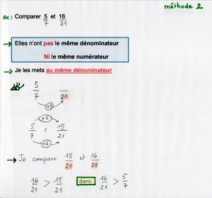 2. j ‘écris les fractions avec le même dénominateur : on pensera à bien faire énoncer le dénominateur choisi (pour l’instant le plus grand… on verra si d’autres critères sont donnés en cours cette année …)